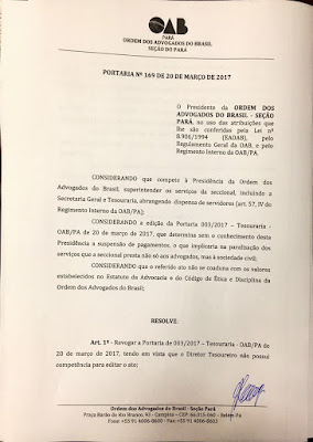 Um mero ato burocrático, de demissão da chefe do setor de arrecadação, ensejou reação desproporcional do diretor tesoureiro da OAB-PA, Robério Abdon d’Oliveira. Alegando que a demissão, com a qual não concorda e sobre a qual nem fora ouvido, causa “graves prejuízos à continuidade do bom desempenho da arrecadação da OAB-PA”, ele baixou hoje a Portaria 003/2017, suspendendo todos os pagamentos da entidade e nomeando para o setor de Arrecadação e Finanças o vice-presidente da Caixa de Assistência, Denis Serruya e os conselheiros Victor Lima, Sávio Barreto e Wesley Loureiro. A gravíssima medida – vejam só – chamada de Plano de Emergência, foi instituída sem prazo de duração, e, conforme o artigo 2º da portaria, “terá a duração necessária até o reequilíbrio administrativo do setor de Arrecadação da OAB-PA”. Alberto Campos de imediato anulou a infeliz portaria do diretor tesoureiro, através da Portaria 169/2017, que determinou à Comissão de Orçamento e Contas que fiscalize o setor de cobranças e instaurou processo ético-disciplinar para apurar a conduta de Robério D’Oliveira, por suposta violação ao Código de Ética e Disciplina, como vocês podem ler na íntegra aí em cima.