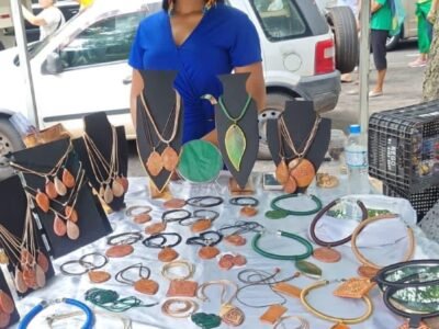 A designer de ecojoias Tifany Macedo, marajoara de Soure, está expondo sua coleção na feira de artesanato da Praça da República, em Belém. ...