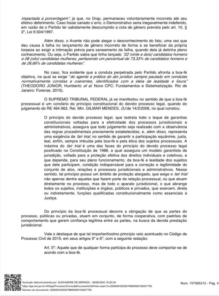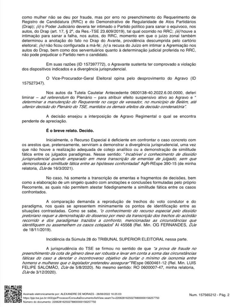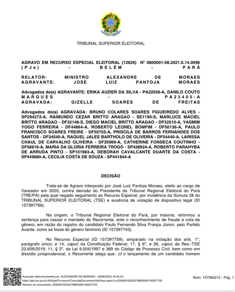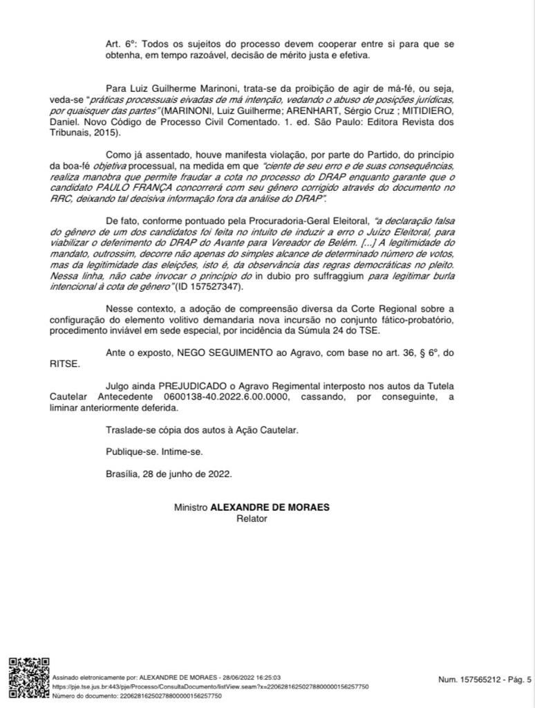 Como já assentado, houve manifesta violação, por parte do partido, do princípio da boa-fé objetiva processual, na medida em que “ciente de seu erro e de suas consequências, realiza manobra que permite fraudar a cota no processo do DRAP enquanto garante que o candidato Paulo França concorrerá com seu gênero corrigido através do documento no RRC, deixando tal decisiva informação fora da análise do DRAP”. De fato, conforme pontuado pela Procuradoria-Geral Eleitoral, “a declaração falsa do gênero de um dos candidatos foi feita no intuito de induzir a erro o Juízo Eleitoral, para viabilizar o deferimento do DRAP do Avante para Vereador de Belém. […] A legitimidade do mandato, outrossim, decorre não apenas do simples alcance de determinado número de votos, mas da legitimidade das eleições, isto é, da observância das regras democráticas no pleito. Nessa linha, não cabe invocar o princípio do in dubio pro suffraggium para legitimar burla intencional à cota de gênero” (ID 157527347). Nesse contexto, a adoção de compreensão diversa da Corte Regional sobre a configuração do elemento volitivo demandaria nova incursão no conjunto fático-probatório, procedimento inviável em sede especial, por incidência da Súmula 24 do TSE. Ante o exposto, NEGO SEGUIMENTO ao Agravo, com base no art. 36, § 6º, do RITSE. Julgo ainda PREJUDICADO o Agravo Regimental interposto nos autos da Tutela Cautelar Antecedente 0600138-40.2022.6.00.0000, cassando, por conseguinte, a liminar anteriormente deferida”, fulminou Alexandre de Moraes.