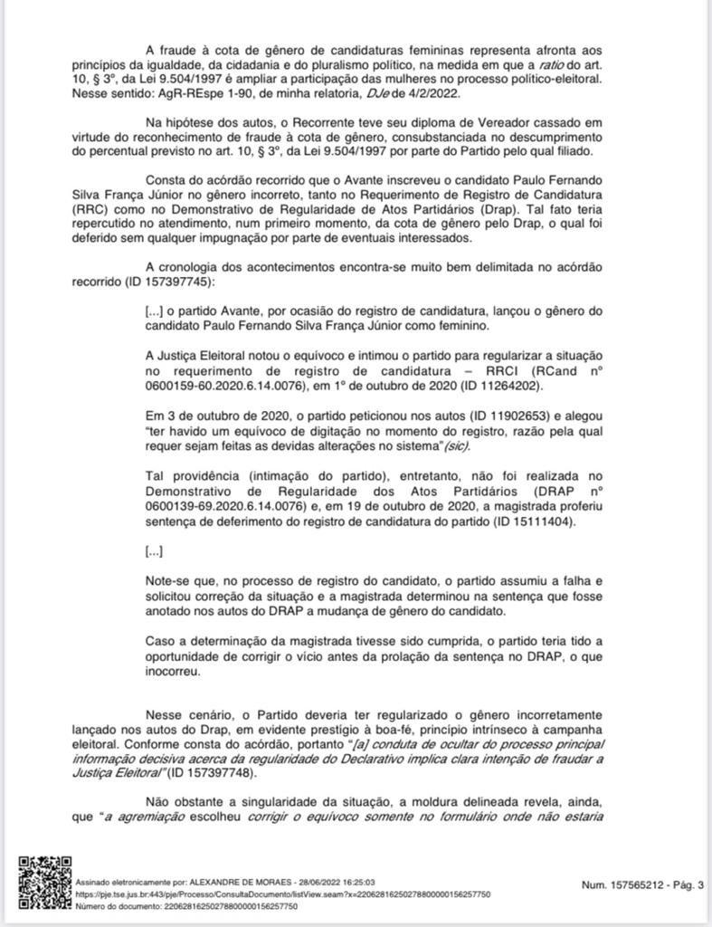 José Luiz Pantoja Moraes foi eleito vereador em 2020. O Tribunal Regional Eleitoral do Pará, por maioria, cassou o mandato, ante o reconhecimento de fraude à cota de gênero, em razão do registro do candidato Paulo Fernando Silva França Júnior, pelo Partido Avante, como se fosse do gênero feminino. No Recurso Especial, Zeca do Barreiro alegou que o lançamento de um candidato homem como mulher não se deu por fraude, mas por erro no preenchimento do Requerimento de Registro de Candidatura (RRC) e do Demonstrativo de Regularidade de Atos Partidários (Drap); que o Poder Judiciário deveria ter intimado o partido político para sanar o equívoco, nos autos, do Drap, tal qual ocorrido no RRC; que houve a intimação para sanar a falha, nos autos, do RRC, momento em que o juízo zonal também determinou a anotação do fato no Drap do Avante, providência descumprida pelo cartório eleitoral; que não ficou configurada a má-fé; e que a recusa do Juízo em intimar a agremiação nos autos do Drap, bem como dos serventuários quanto à determinação judicial proferida no RRC, não pode prejudicar o partido nem o candidato.