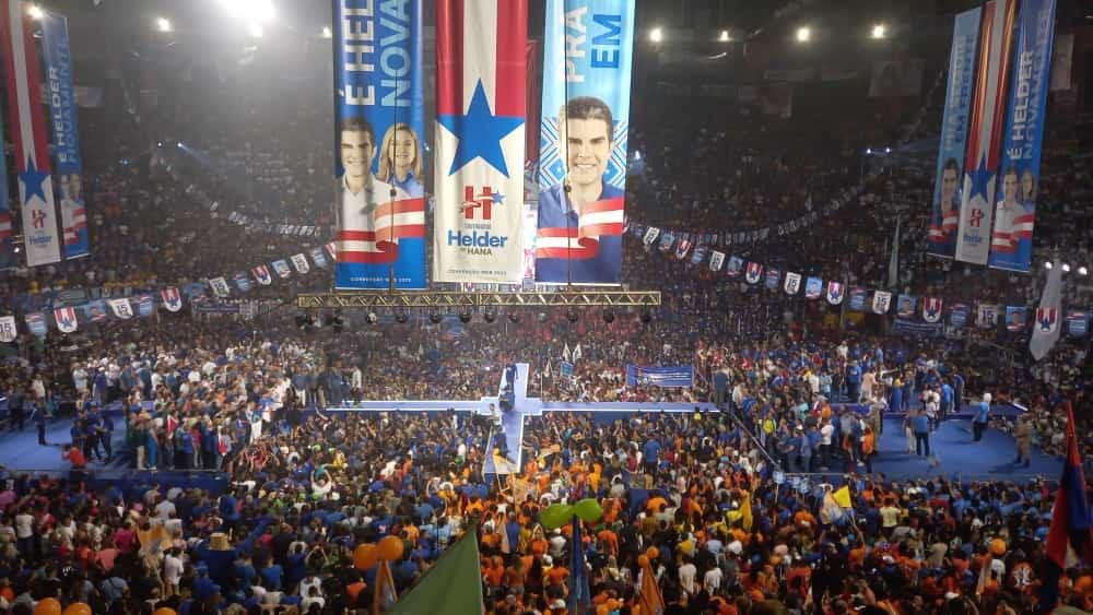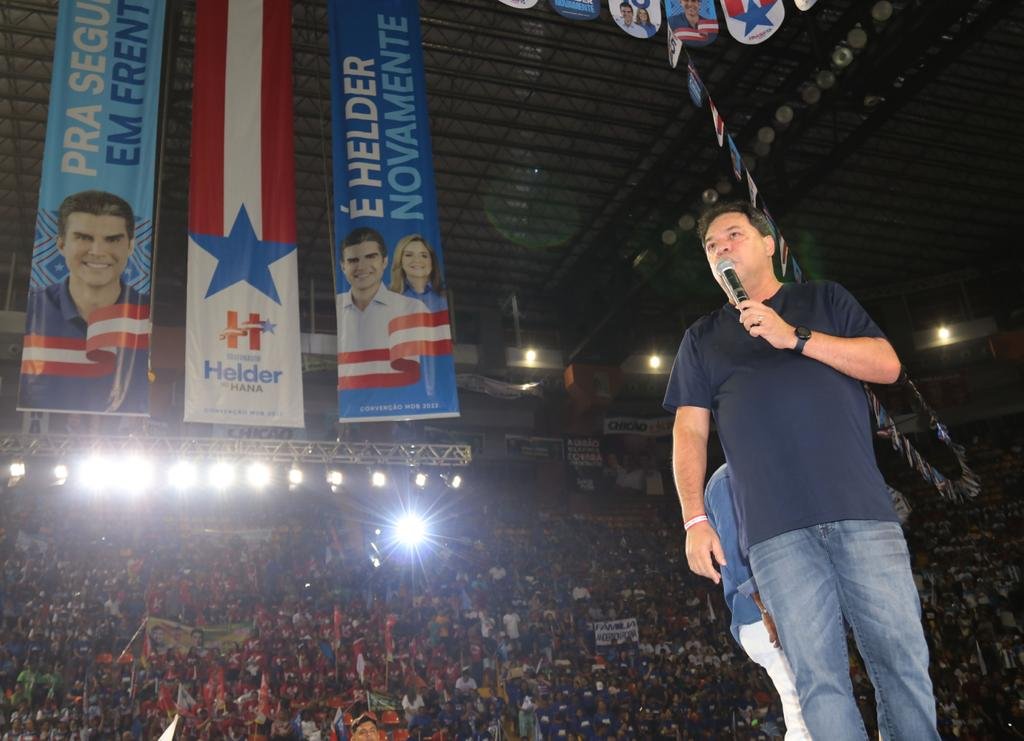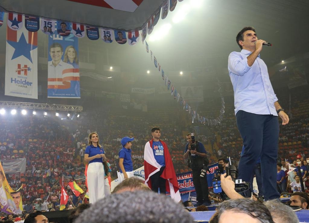 A chegada do governador Helder Barbalho foi apoteótica. Acompanhado pela esposa, Daniela Barbalho, os três filhos, o pai senador Jader Barbalho, a mãe deputada federal Elcione Barbalho e o irmão presidente do MDB Pará Jader Barbalho Filho, fez valer a alcunha de “Rei do Norte”. Tivesse entrado com a bandeira do Pará sobre os ombros, como fez o filho primogênito, a cena de Game of Thrones estaria perfeita. Helder Filho, tal qual seu pai em idade ainda mais tenra em 1982, na primeira eleição de Jader ao Governo do Pará, surgiu no palco antecipando sua destinação precoce à política. Certamente está predestinado a, daqui a dois anos, aos 18, assumir a vocação. A linda Heva, do alto dos seus sete anos, tal qual a mãe muito focada pelos holofotes e à vontade mesmo entre desconhecidos, era disputada para selfies. A vice Hanna Ghassan, com o marido e demais familiares, fez sua estreia com a timidez já esperada de uma técnica contracenando com felpudas raposas políticas. Ali estavam, juntos e misturados harmoniosamente, disputando com desenvoltura centímetros de espaço no palco, comunistas, petistas, verdes, tucanos, trabalhistas, republicanos, socialistas, pedetistas, pessedistas, MST e etecetera e tal, dentre as quinze siglas que apoiam oficialmente a reeleição de Helder Barbalho.