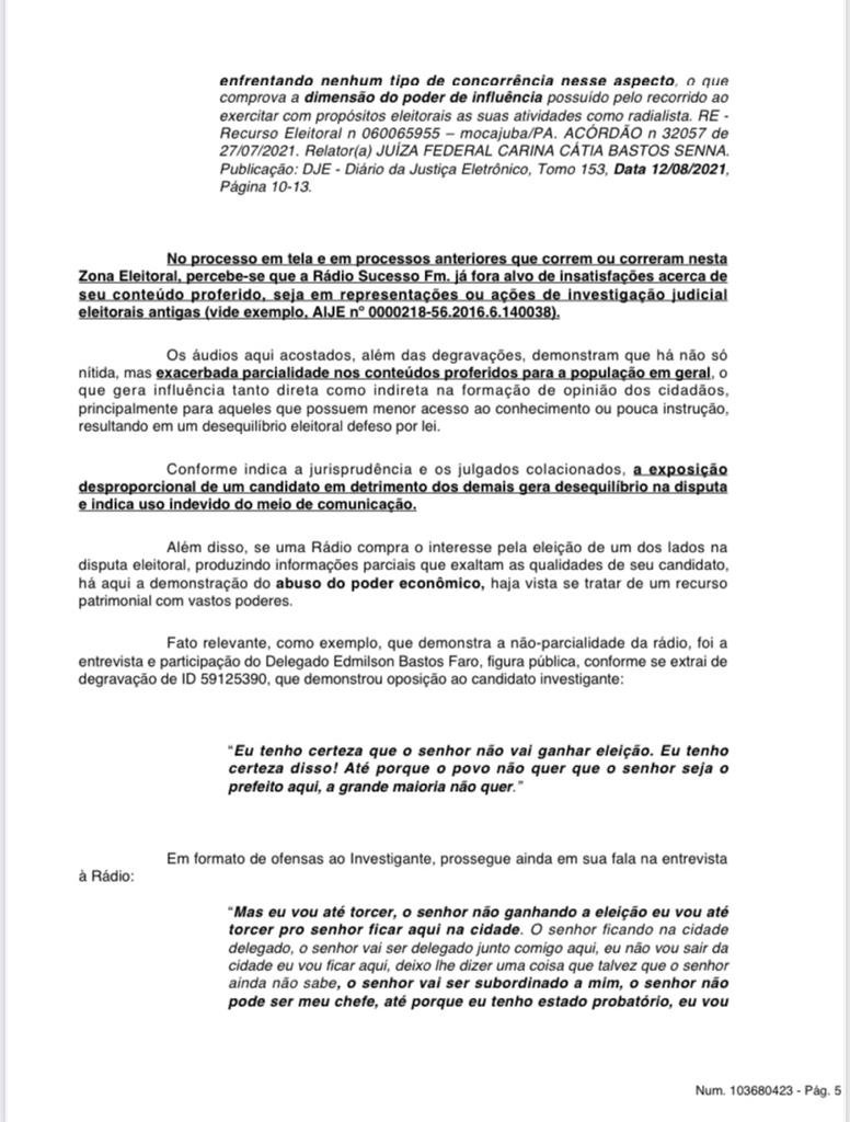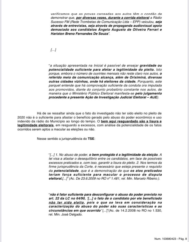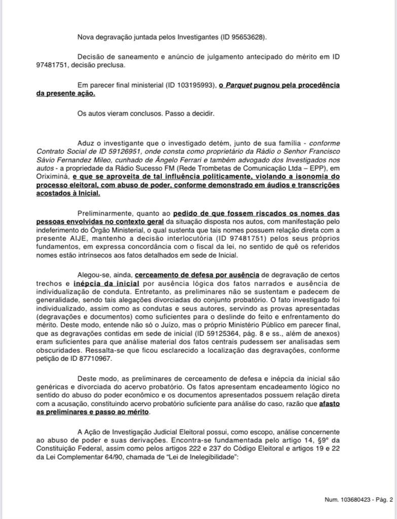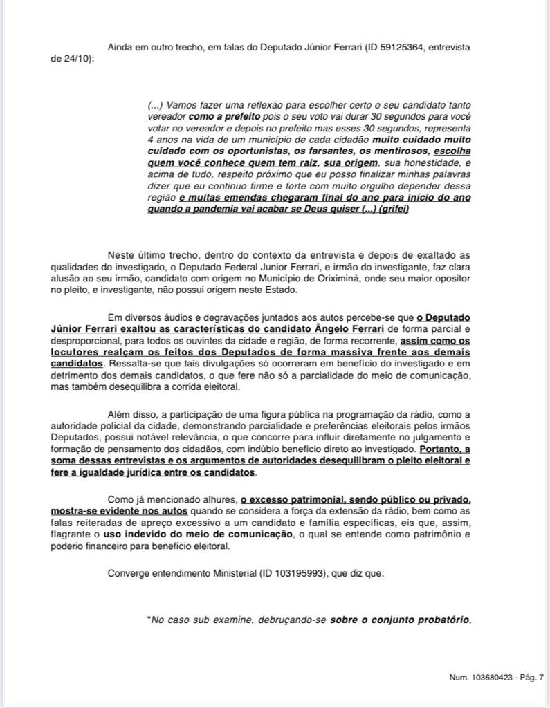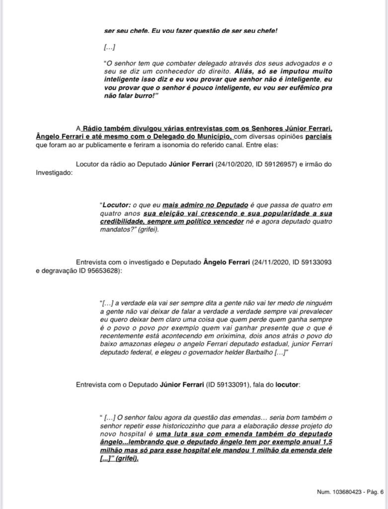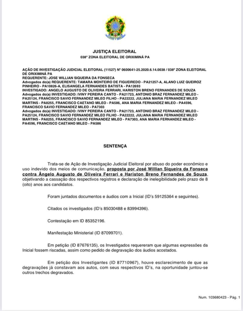Hoje no início da tarde o juiz Wallace Carneiro de Sousa, da 38ª Zona Eleitoral, de Oriximiná, decretou a inelegibilidade do deputado estadual Ângelo Ferrari, por oito anos, a partir de 2020, por abuso de poder econômico ou político, e uso indevido de meio de comunicação social – no caso, a rádio de sua família. A decisão se deu nos autos da AIJE – Ação de Investigação Judicial Eleitoral nº 0600641-25.2020.6.14.0038, movida por José Willian Fonseca, o Delegado Fonseca, prefeito eleito e atualmente afastado do cargo pela Câmara Municipal de Oriximiná.