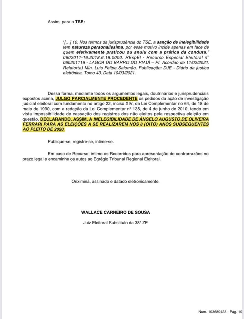 Ângelo Ferrari pode recorrer ao Tribunal Regional Eleitoral e ao Tribunal Superior Eleitoral. Confiram o inteiro teor da sentença.
