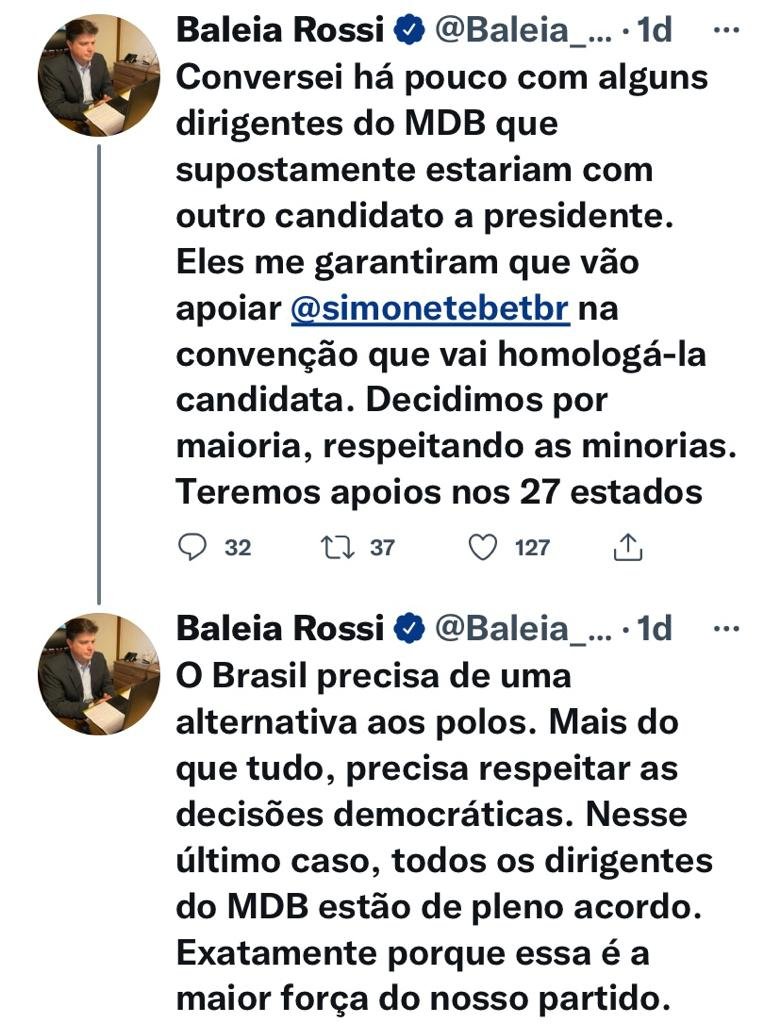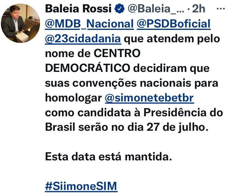 Mas Baleia Rossi, que acompanha todos os movimentos, se apressou a postar logo em seu Twitter a decisão de não arredar pé do que já está agendado. E fulminou: “MDB, PSDB e Cidadania, que atendem pelo nome de Centro Democrático, decidiram que suas convenções nacionais para homologar Simone Tebet como candidata à Presidência do Brasil serão no dia 27 de julho. Esta data está mantida. #SiimoneSIM”. E PT saudações, como diria o caboclo. Baleia Rossi afiança que os diretórios estaduais do MDB estão com Tebet.