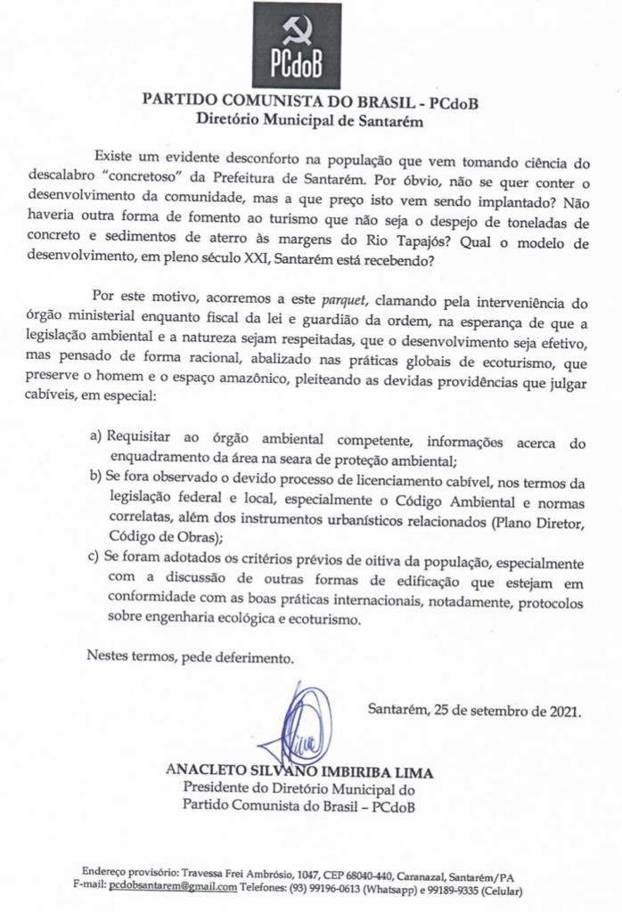O diretório do PCdoB de Santarém do Pará protocolou “Notícia de Fato” junto à 9ª Promotoria de Justiça e Meio Ambiente, Patrimônio Cultural, Habitação e Turismo do Ministério Público do Pará, requerendo que apure a construção de projeto arquitetônico que ameaça a praia de Ponta de Pedras. Acreditem. A Prefeitura de Santarém quer escavar as areias cantadas em prosa e verso pelos poetas e compositores locais para fazer lá um monstrengo de cimento. Sim, na contramão de todas as iniciativas em âmbito planetário e sem óbice do MPPA, MPF e órgãos ambientais, o prefeito Nélio Aguiar, médico esclarecido, cidadão viajado, acabou de inaugurar uma passarela de concreto que viola a paisagem natural, afetando o meio ambiente de forma irreversível, na praia de Maracanã. E quer multiplicar a desastrosa iniciativa, que passará seu nome à história de modo triste.